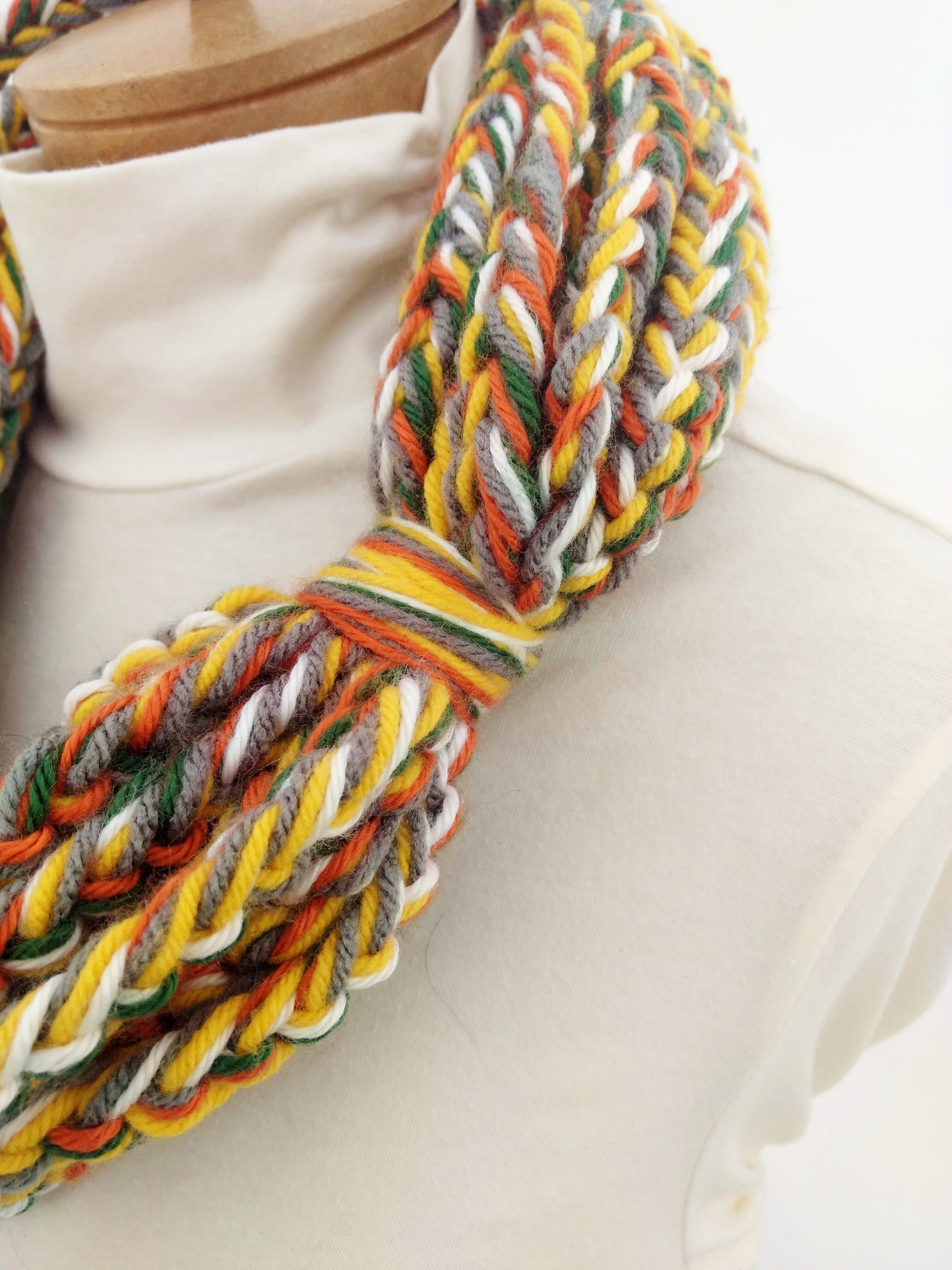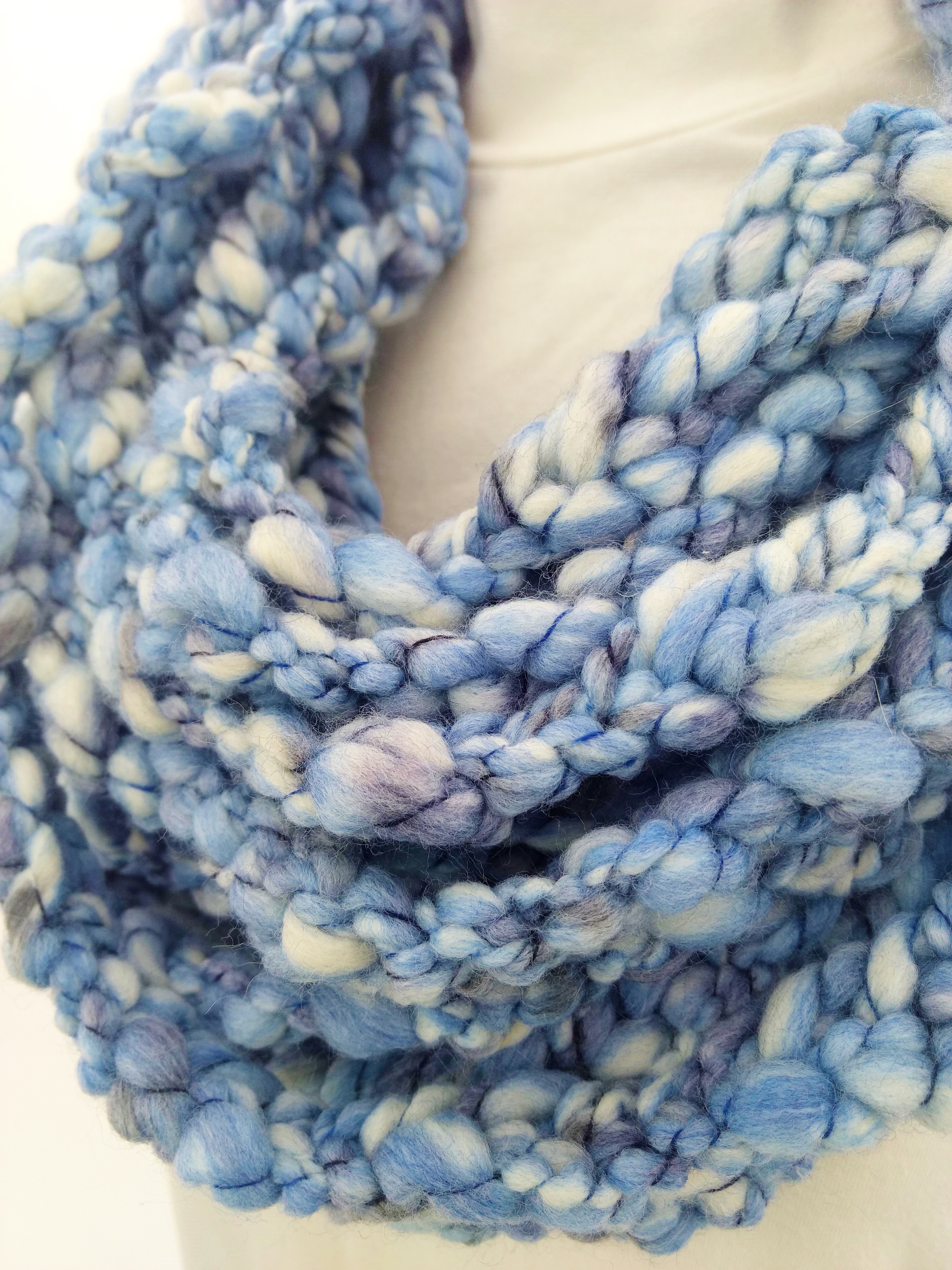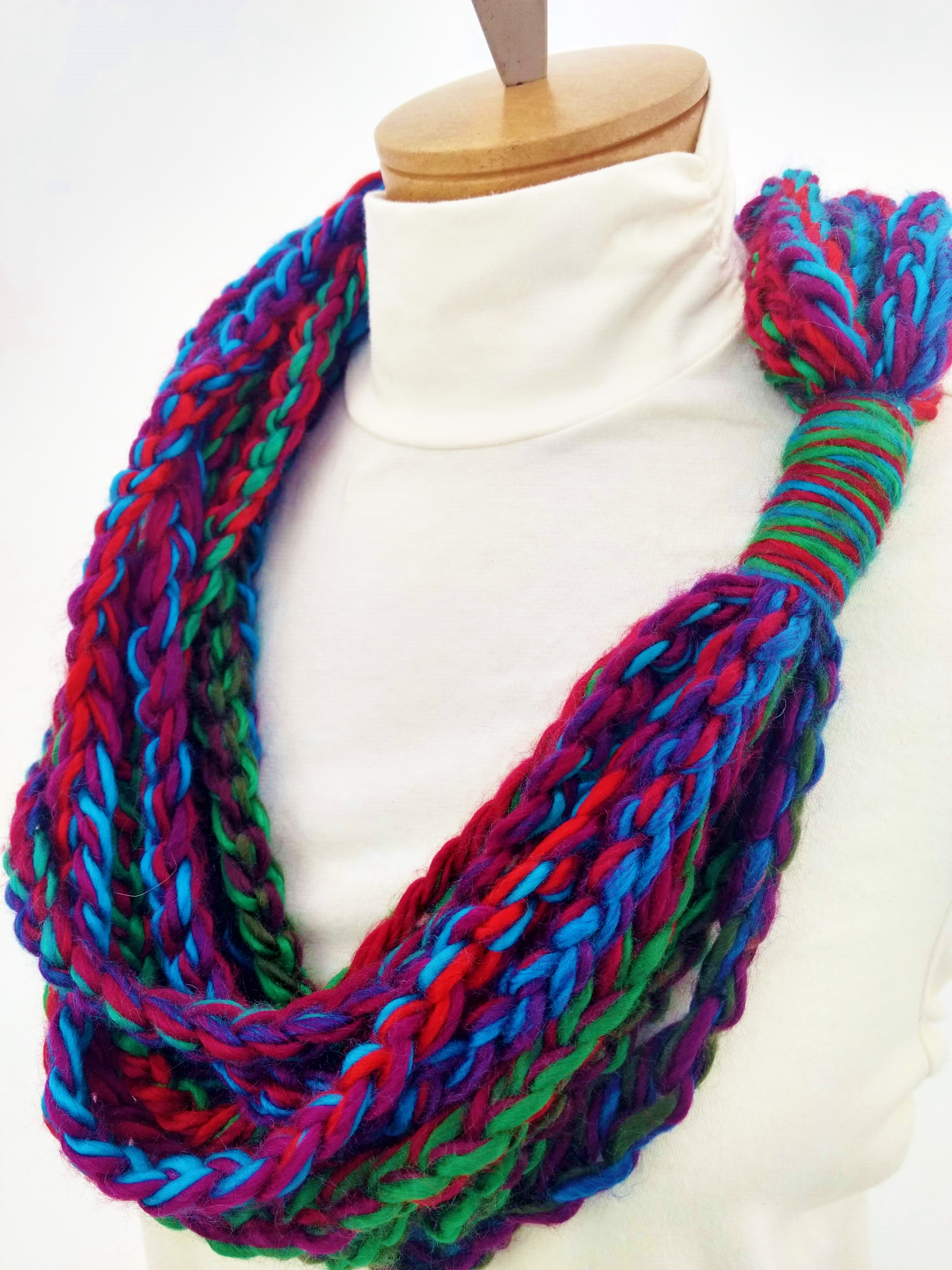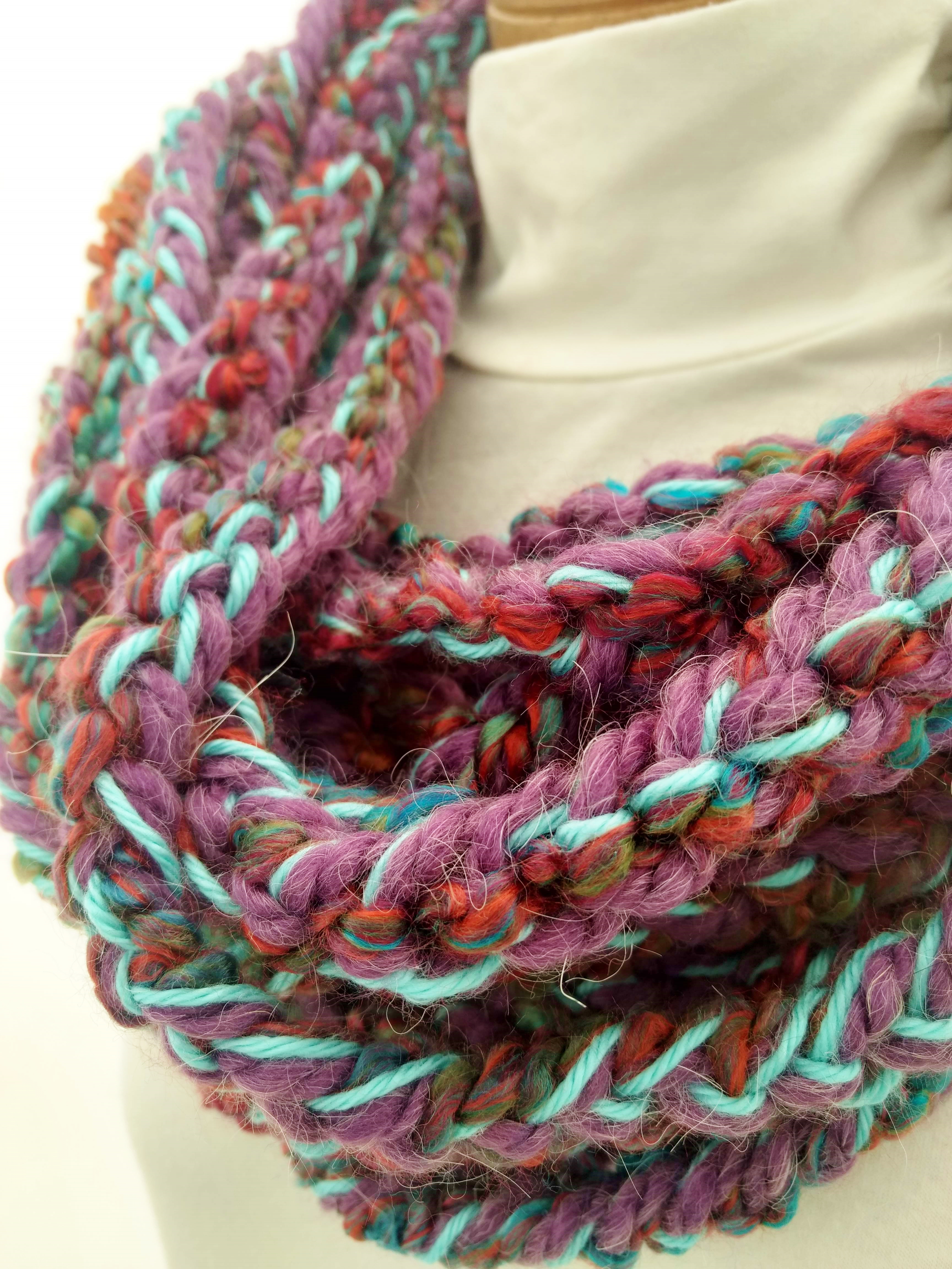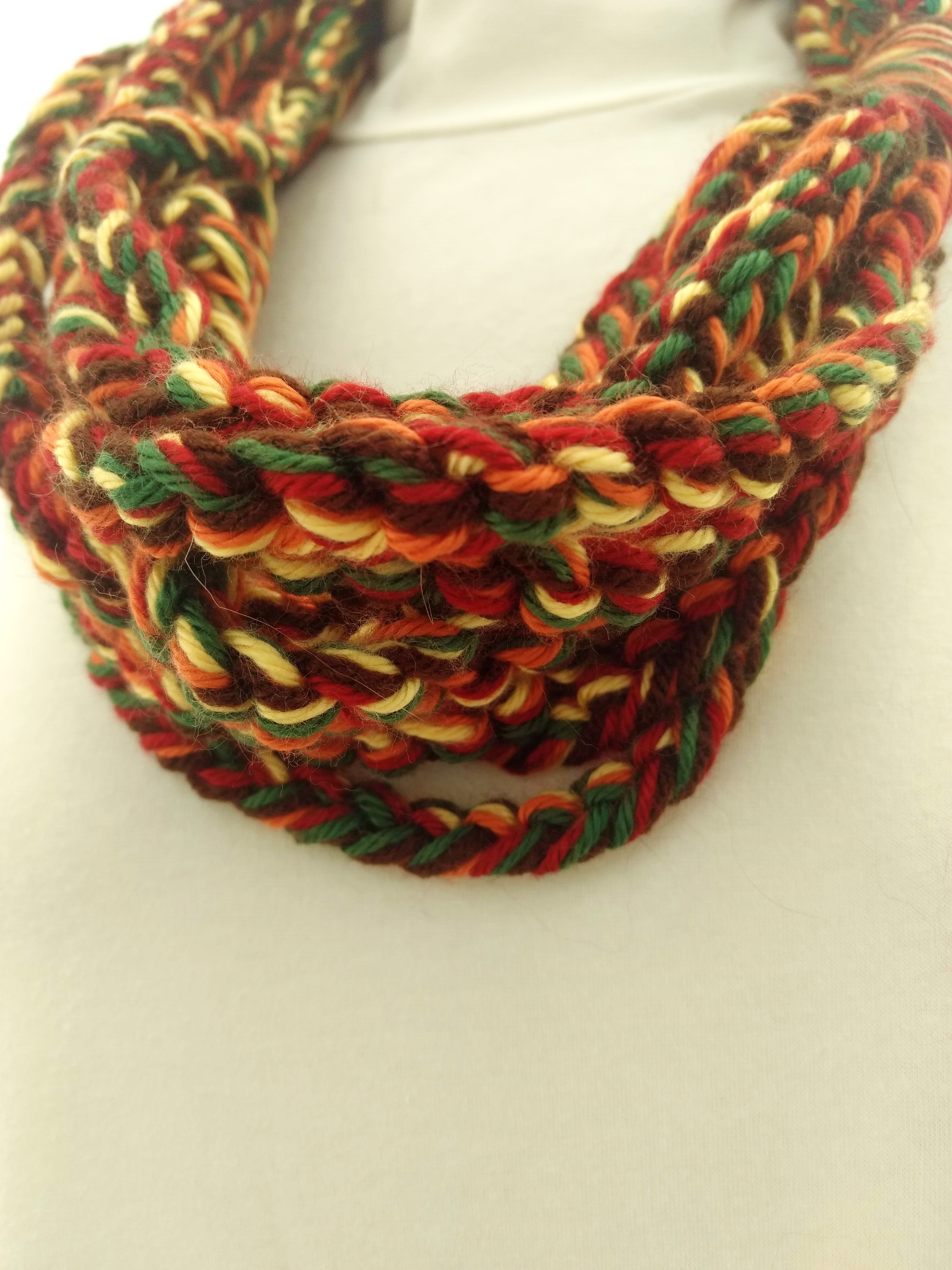 My scarves are handmade by me in my smoke-free, pet-free home studio. I finger crochet each one, rarely using a crochet hook. Each scarf is made of one long crochet chain creating a rope. I then create multiple loops by making a winding cuff of the same yarn around all the strands to hold them together. I keep each scarf a certain size with the help of a board that my husband, Ricky, made me so each one is measured appropriately before finishing. I have different size boards so I can choose how long or short to make each scarf. Each one takes three to four hours to make depending on how many strands of yarn I use, the texture of the yarn, and the size of each strand. What I love most about my scarves is that they can be worn indoors and out. They are the perfect weight to keep you warm with or without a coat. They add a unique look to any outfit. Most of my scarves are OOAK (One of a Kind), meaning you will not see another person wearing a replica.
