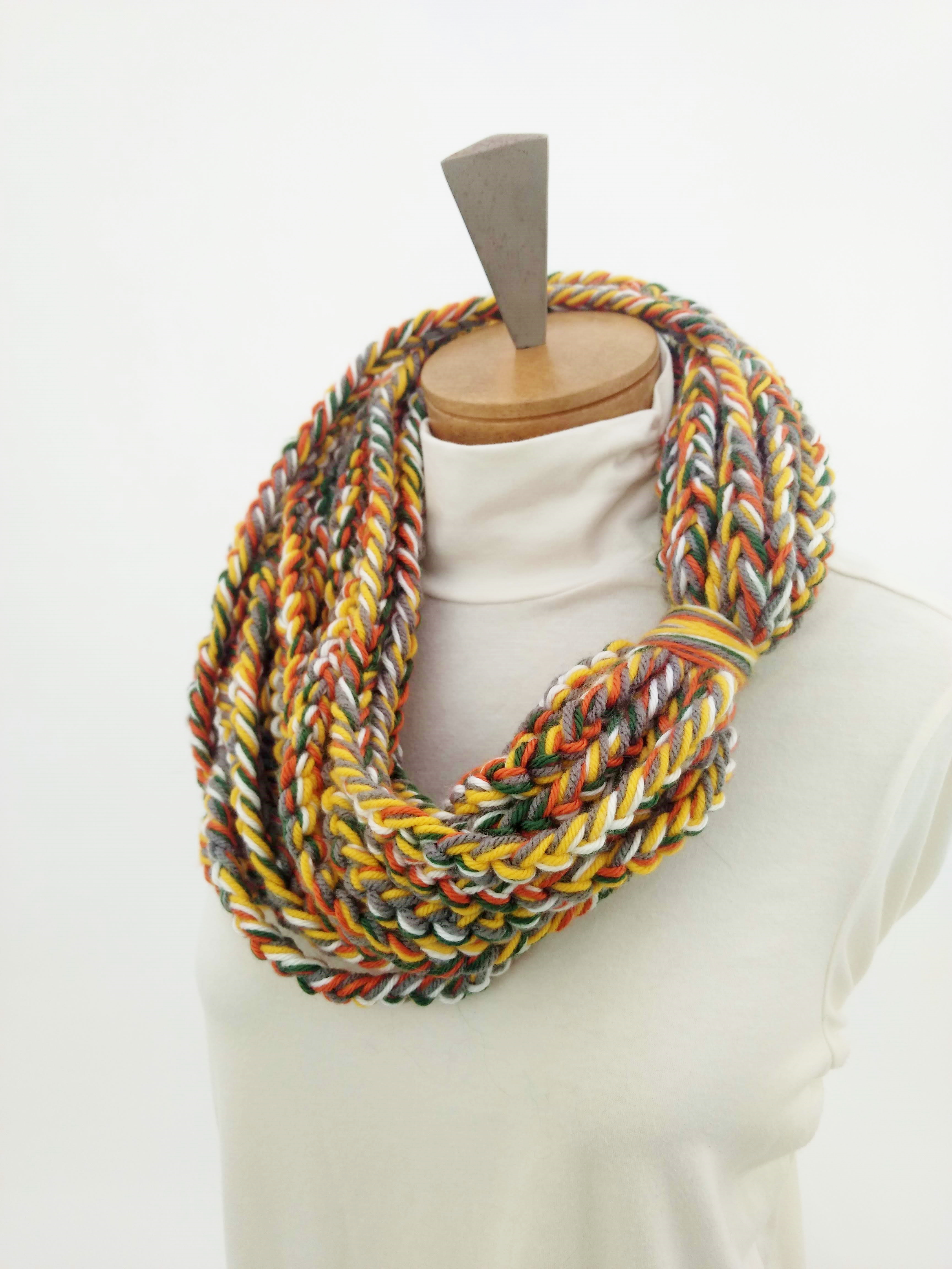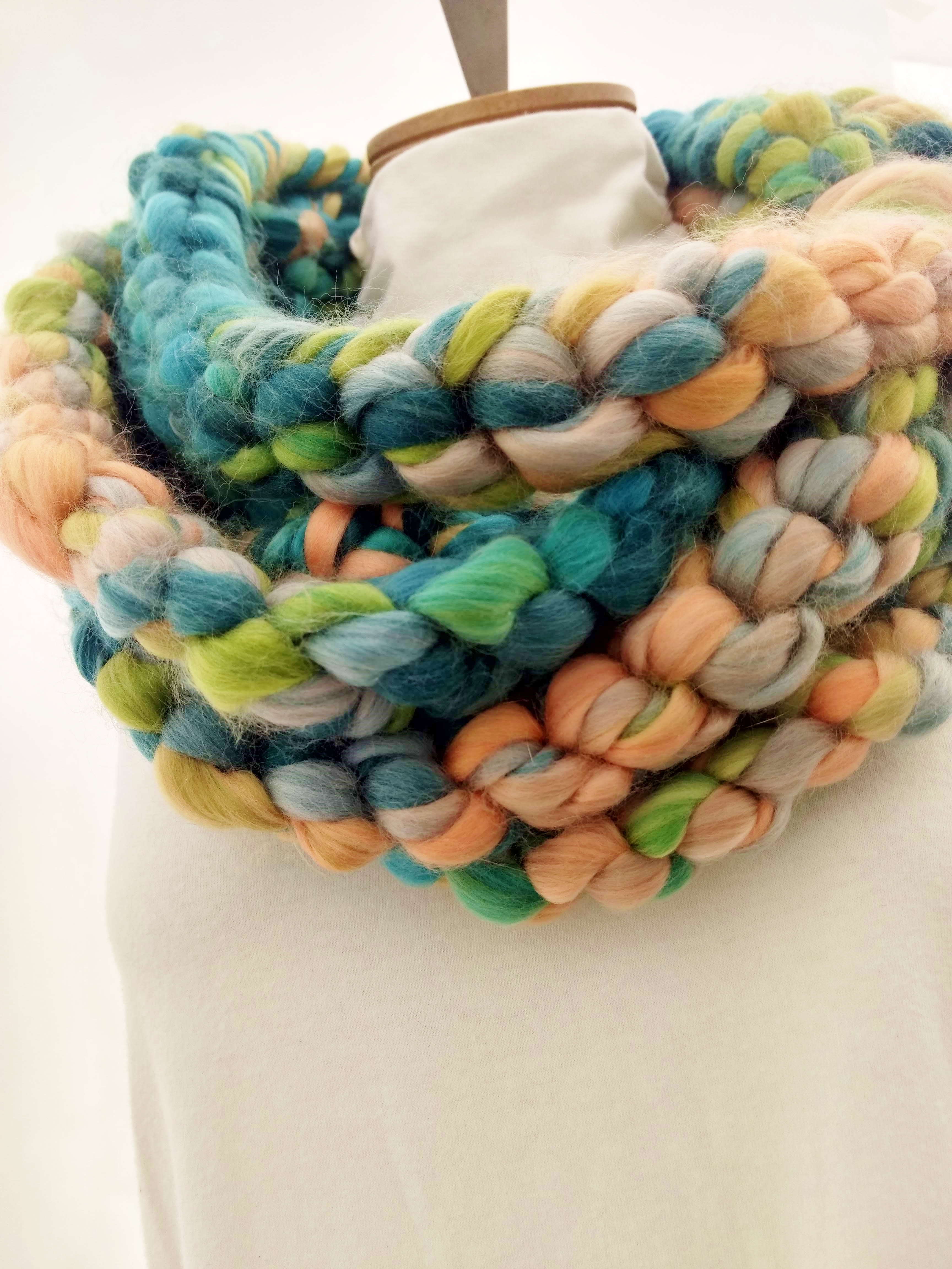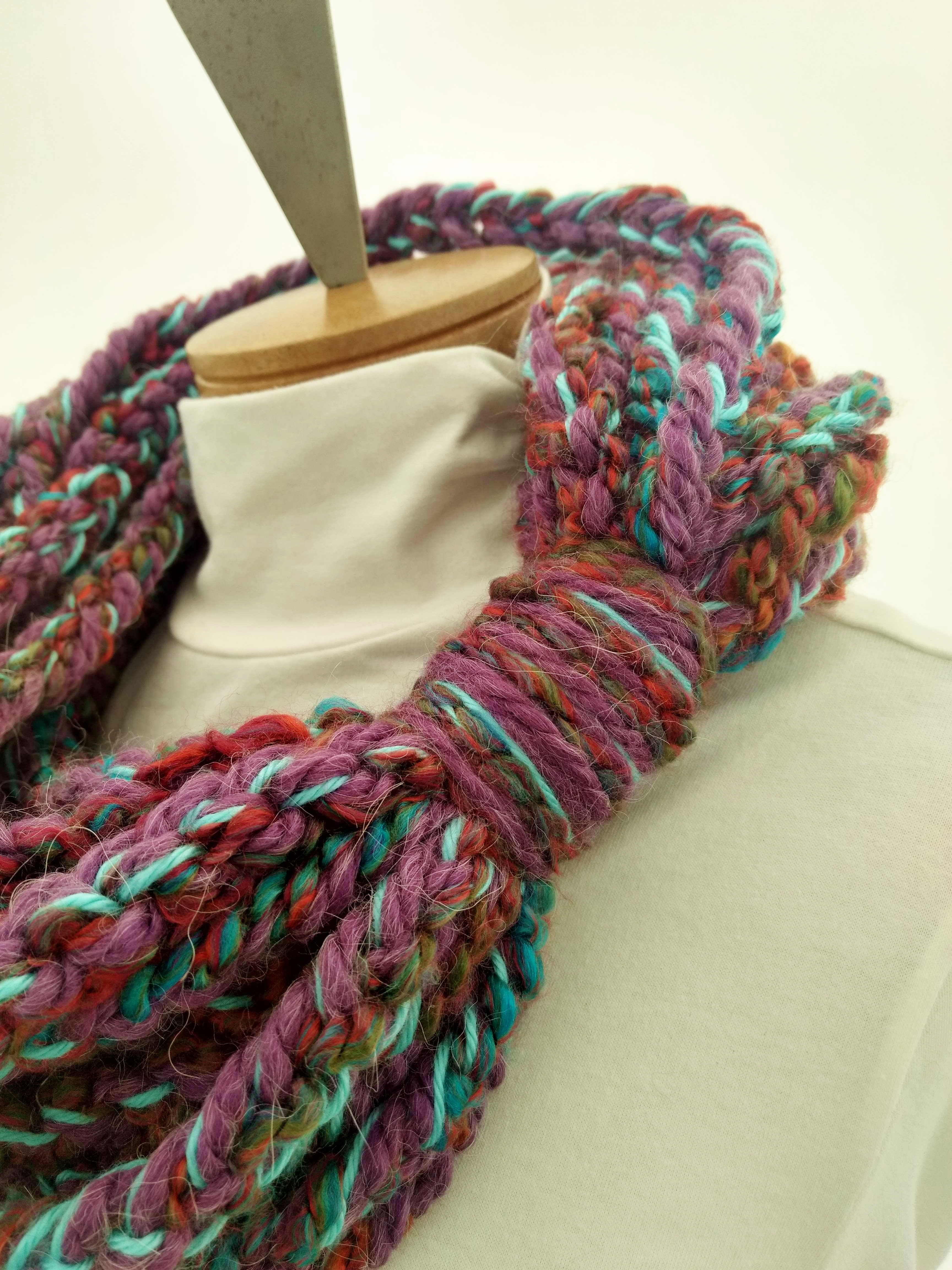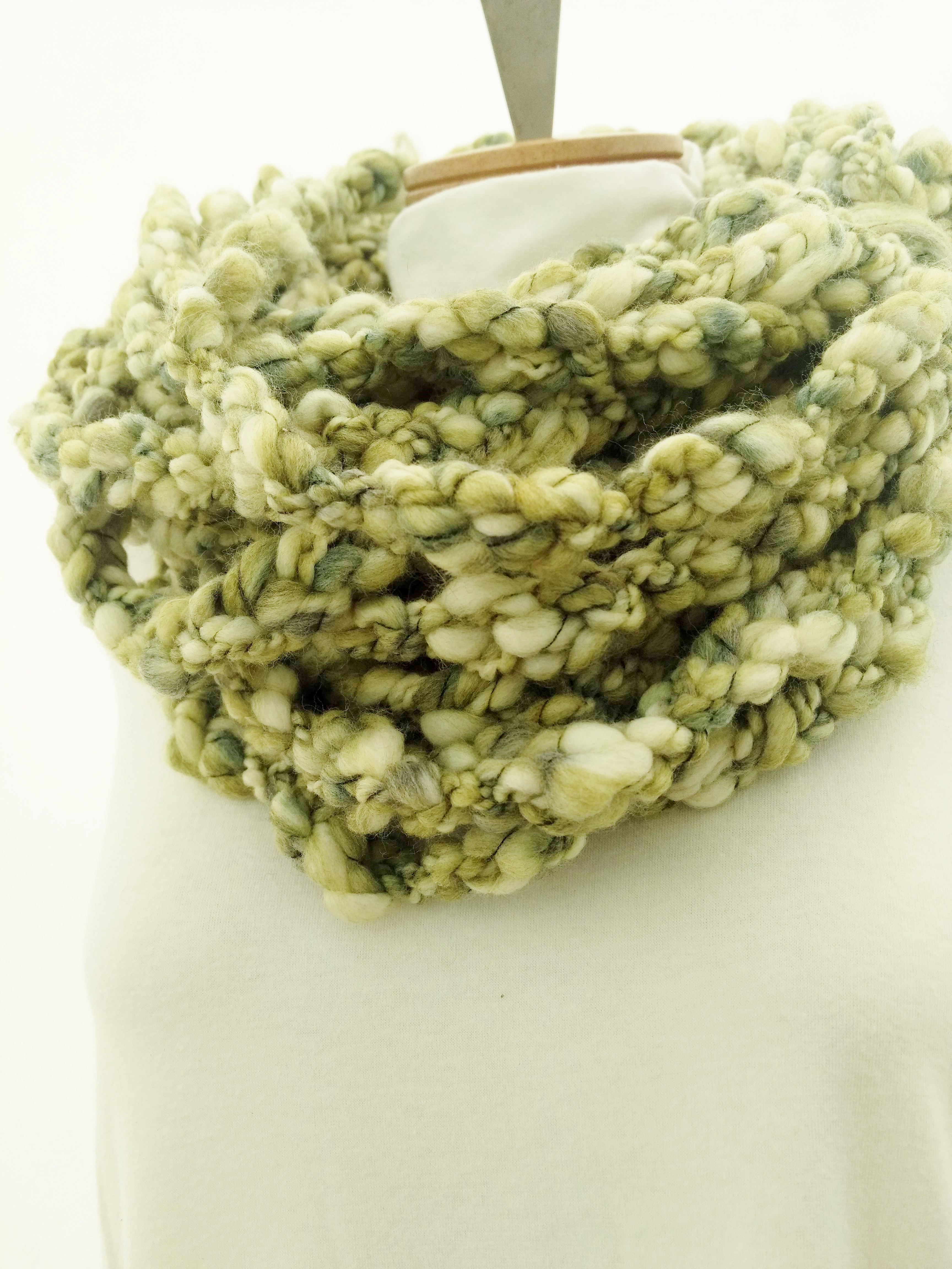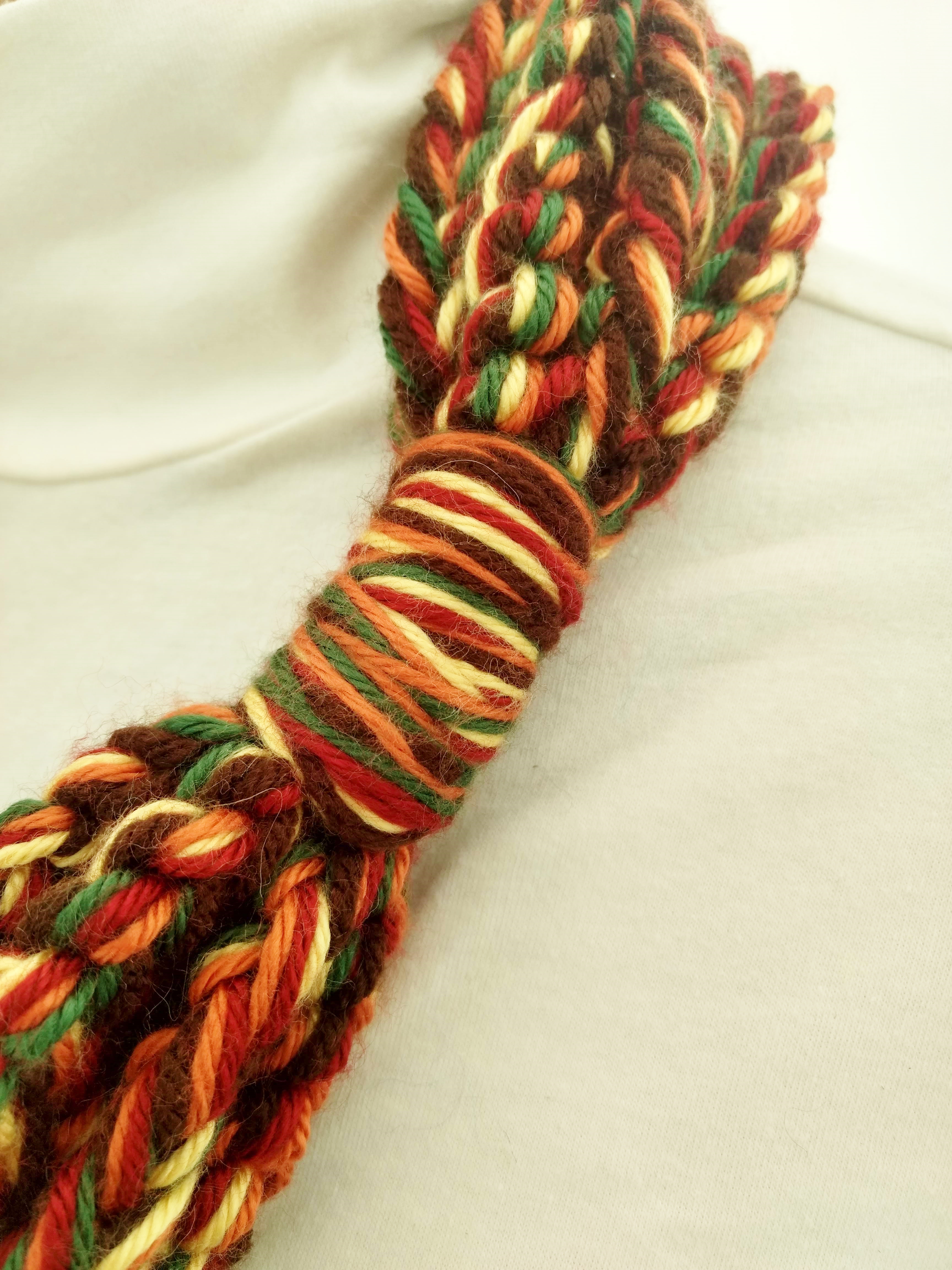 My scarves are handmade by me in my smoke-free, pet-free home studio. I finger crochet each one, rarely using a crochet hook. Each scarf is made of one long crochet chain creating a rope. I then create multiple loops by making a winding cuff of the same yarn around all the strands to hold them together. I keep each scarf a certain size with the help of a board that my husband, Ricky, made me so each one is measured appropriately before finishing. I have different size boards so I can choose how long or short to make each scarf. Each one takes three to four hours to make depending on how many strands of yarn I use, the texture of the yarn, and the size of each strand. What I love most about my scarves is that they can be worn indoors and out. They are the perfect weight to keep you warm with or without a coat. They add a unique look to any outfit. Most of my scarves are OOAK (One of a Kind), meaning you will not see another person wearing a replica.