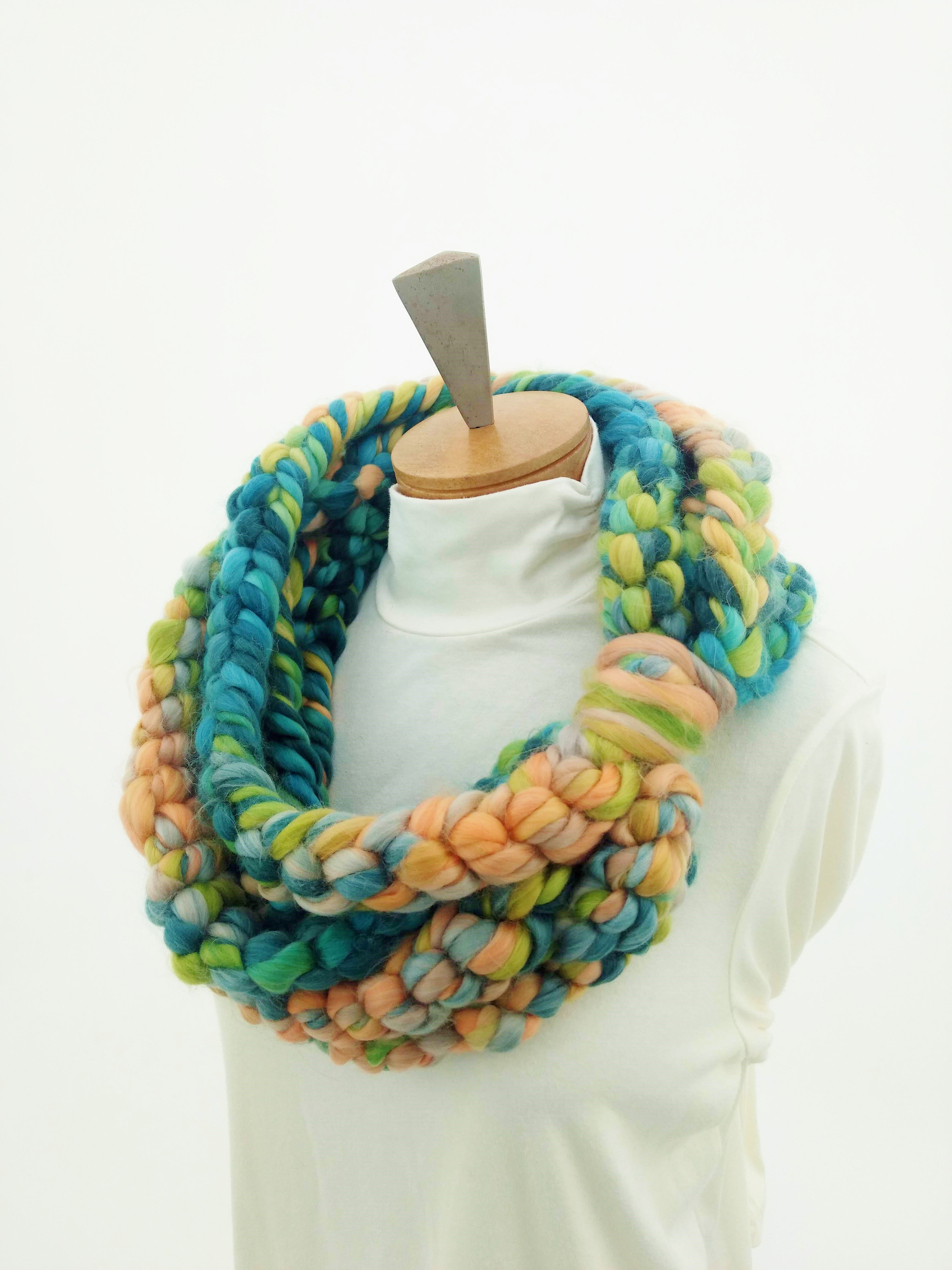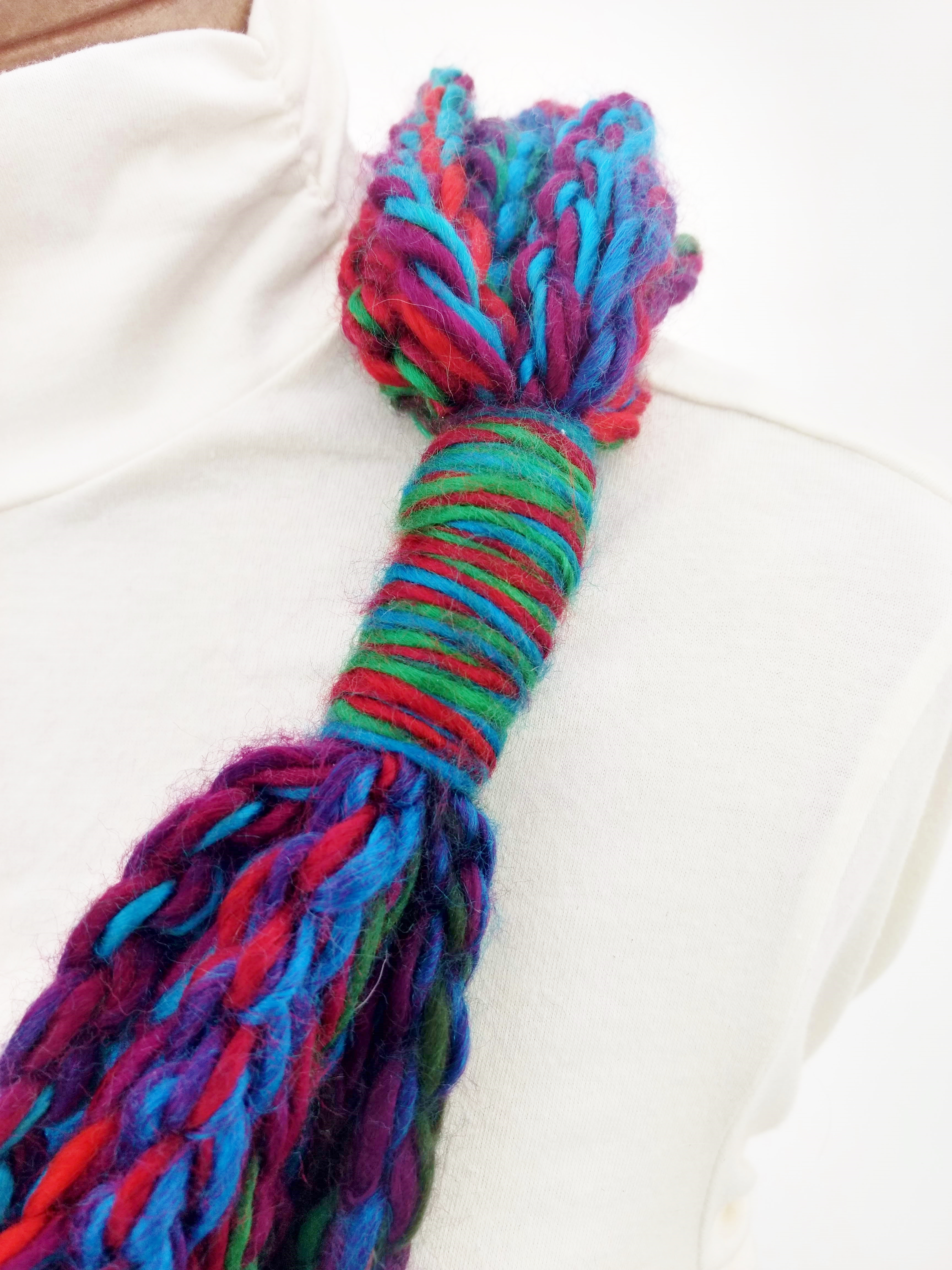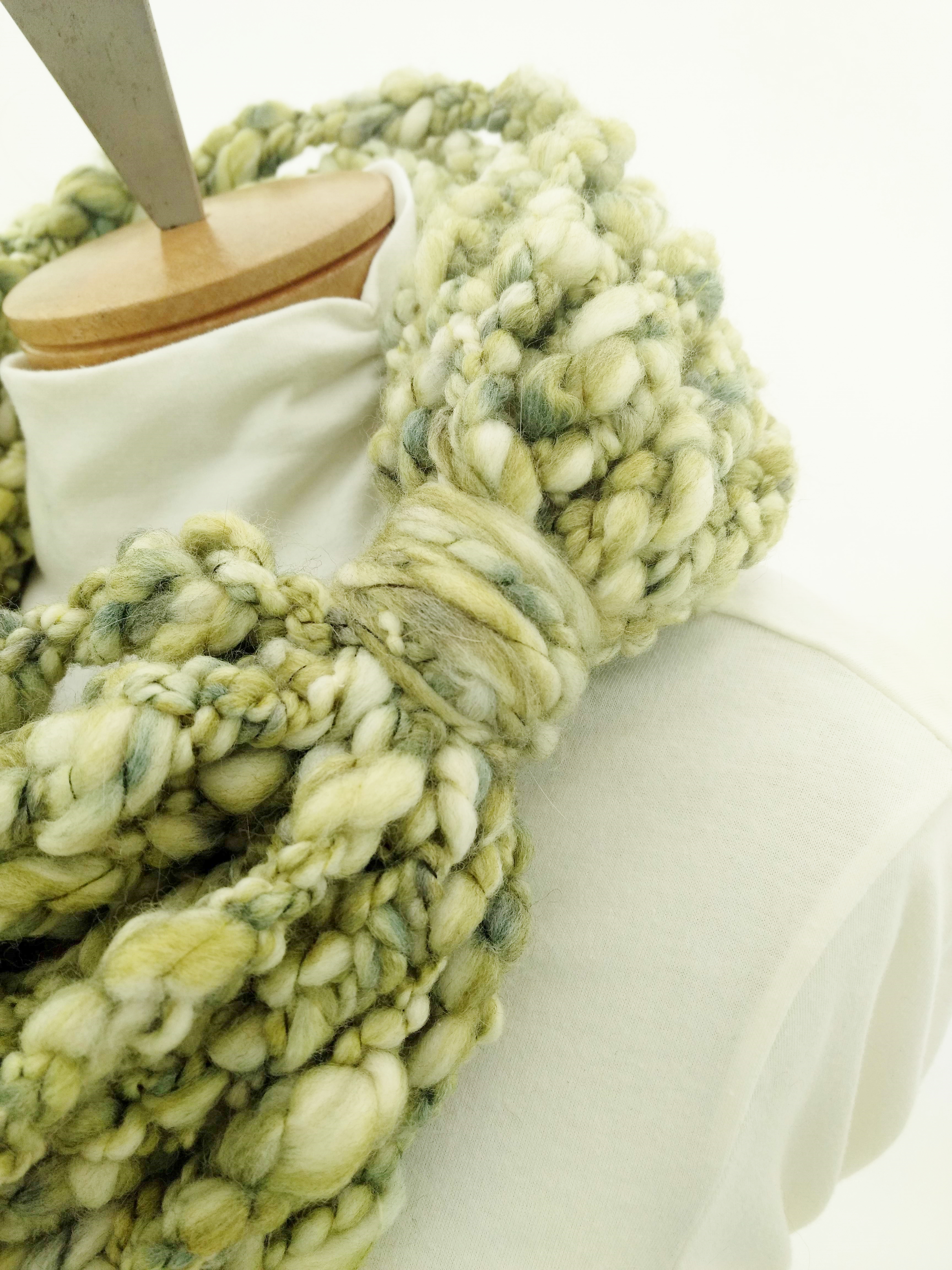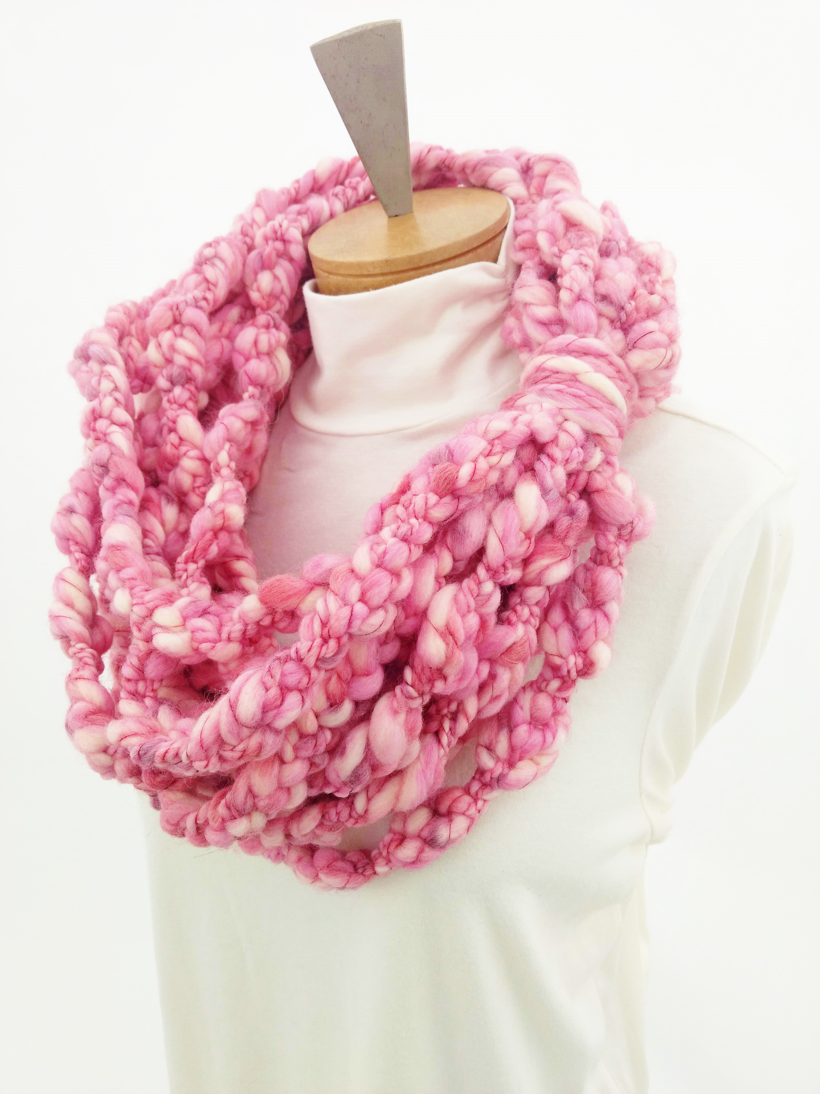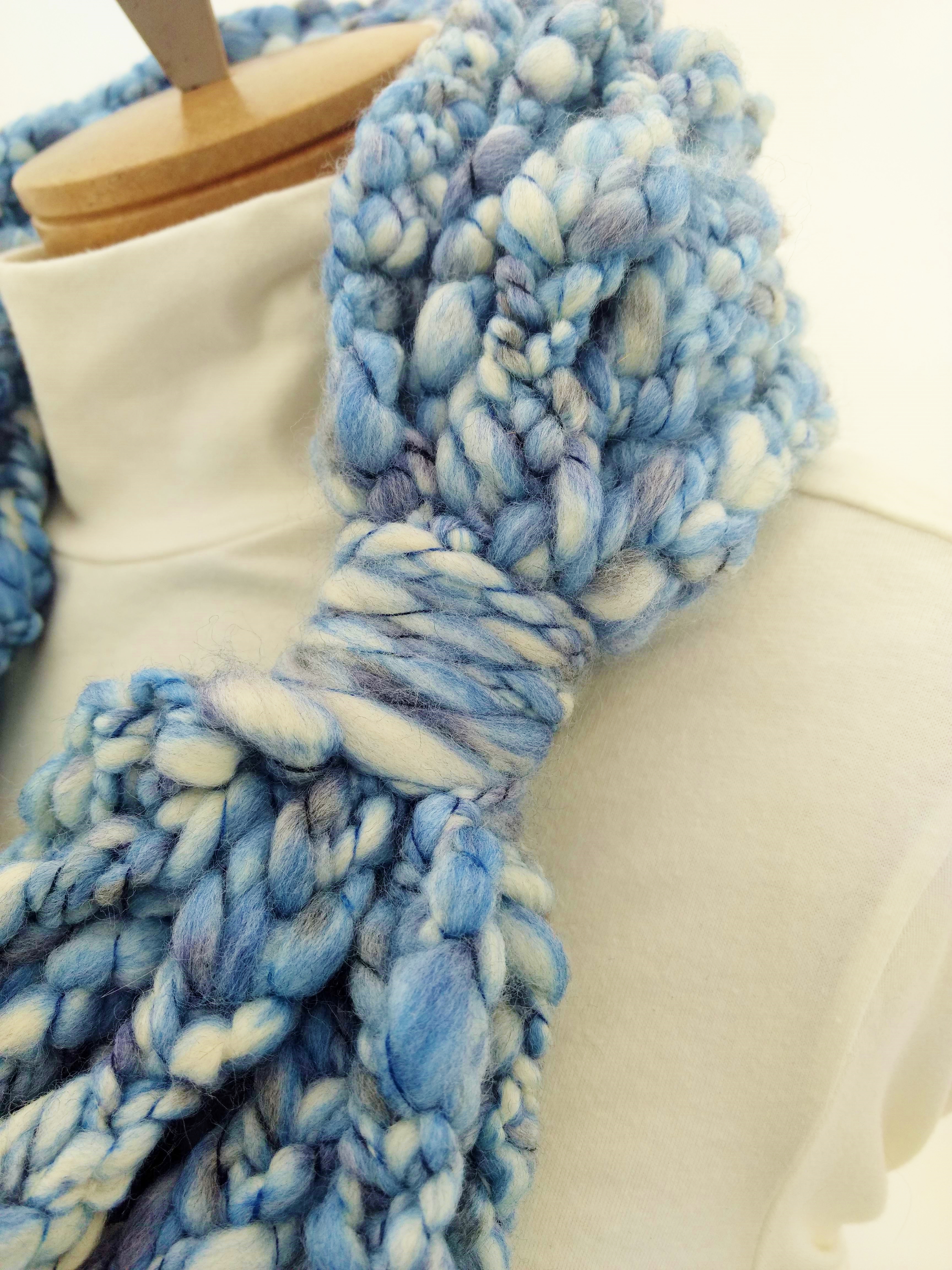 My scarves are handmade by me in my smoke-free, pet-free home studio. I finger crochet each one, rarely using a crochet hook. Each scarf is made of one long crochet chain creating a rope. I then create multiple loops by making a winding cuff of the same yarn around all the strands to hold them together. I keep each scarf a certain size with the help of a board that my husband, Ricky, made me so each one is measured appropriately before finishing. I have different size boards so I can choose how long or short to make each scarf. Each one takes three to four hours to make depending on how many strands of yarn I use, the texture of the yarn, and the size of each strand. What I love most about my scarves is that they can be worn indoors and out. They are the perfect weight to keep you warm with or without a coat. They add a unique look to any outfit. Most of my scarves are OOAK (One of a Kind), meaning you will not see another person wearing a replica.