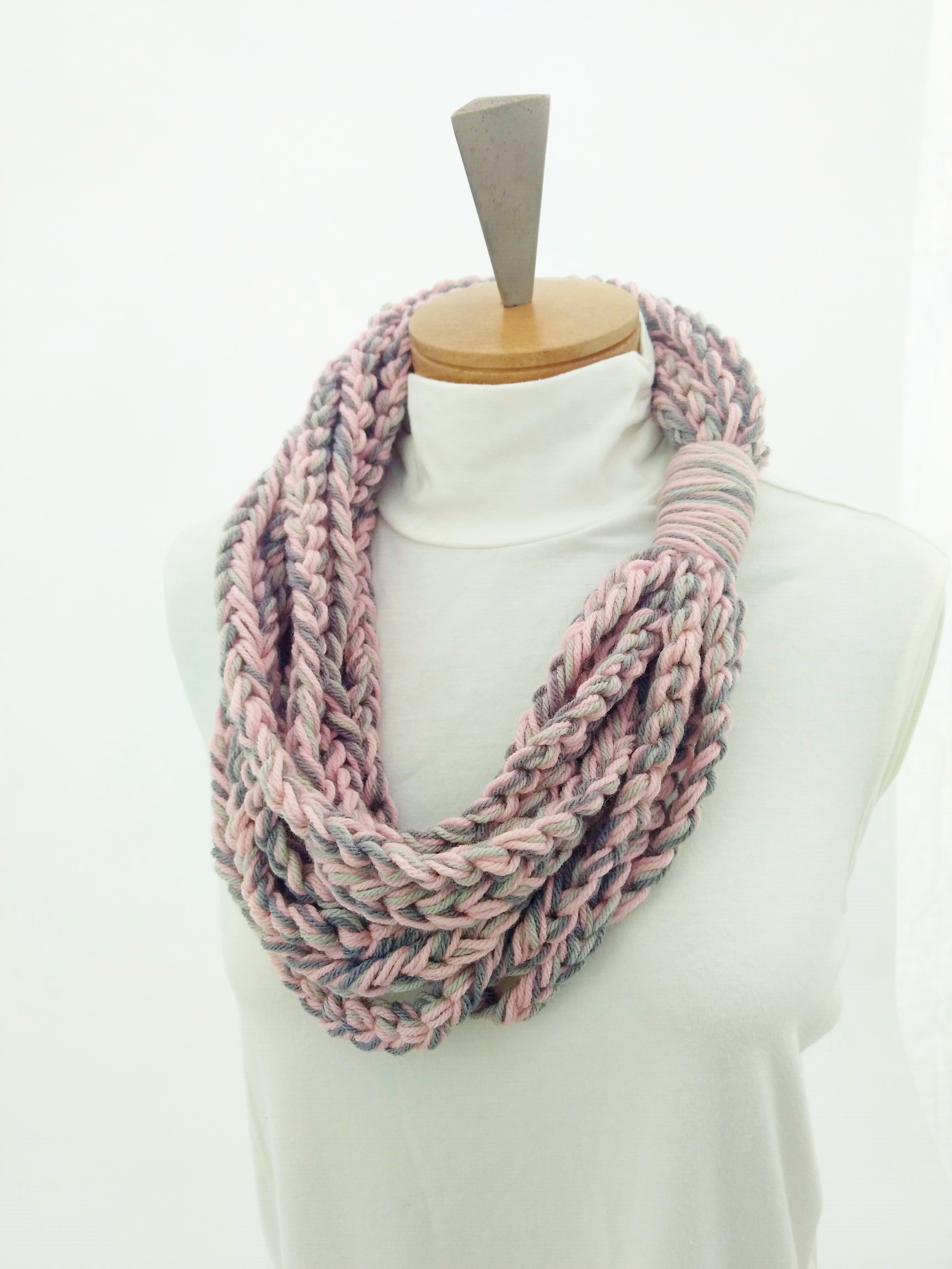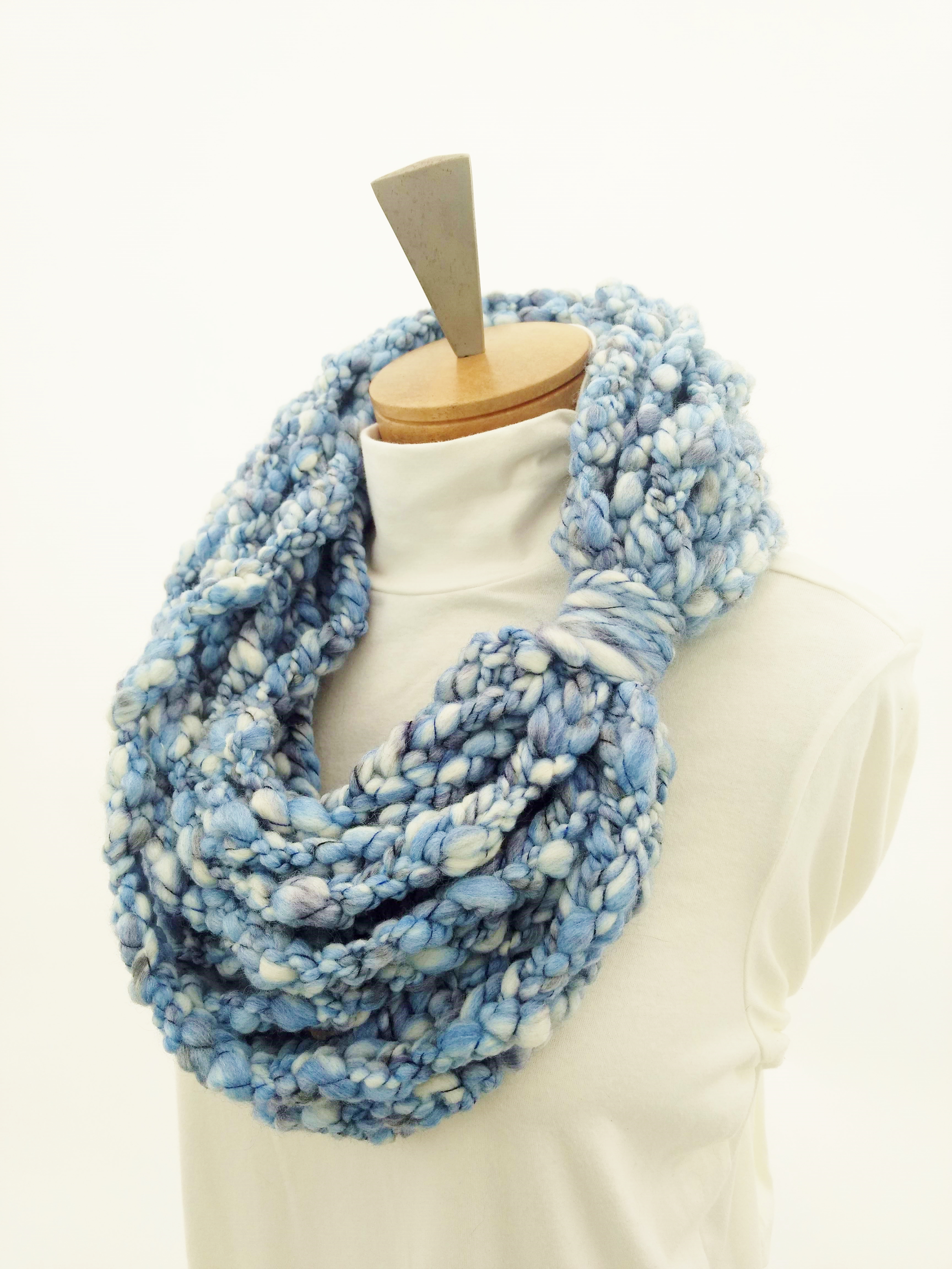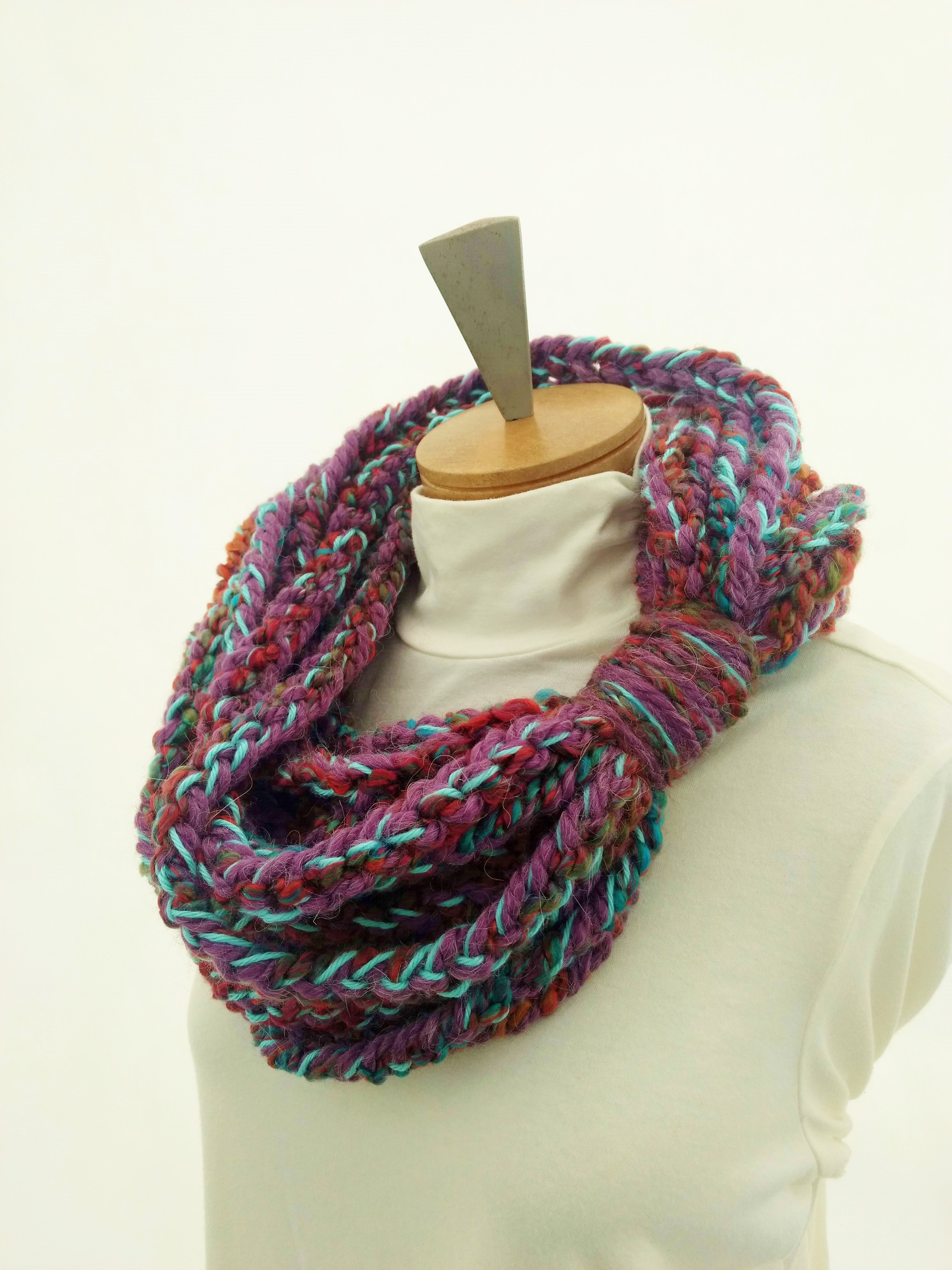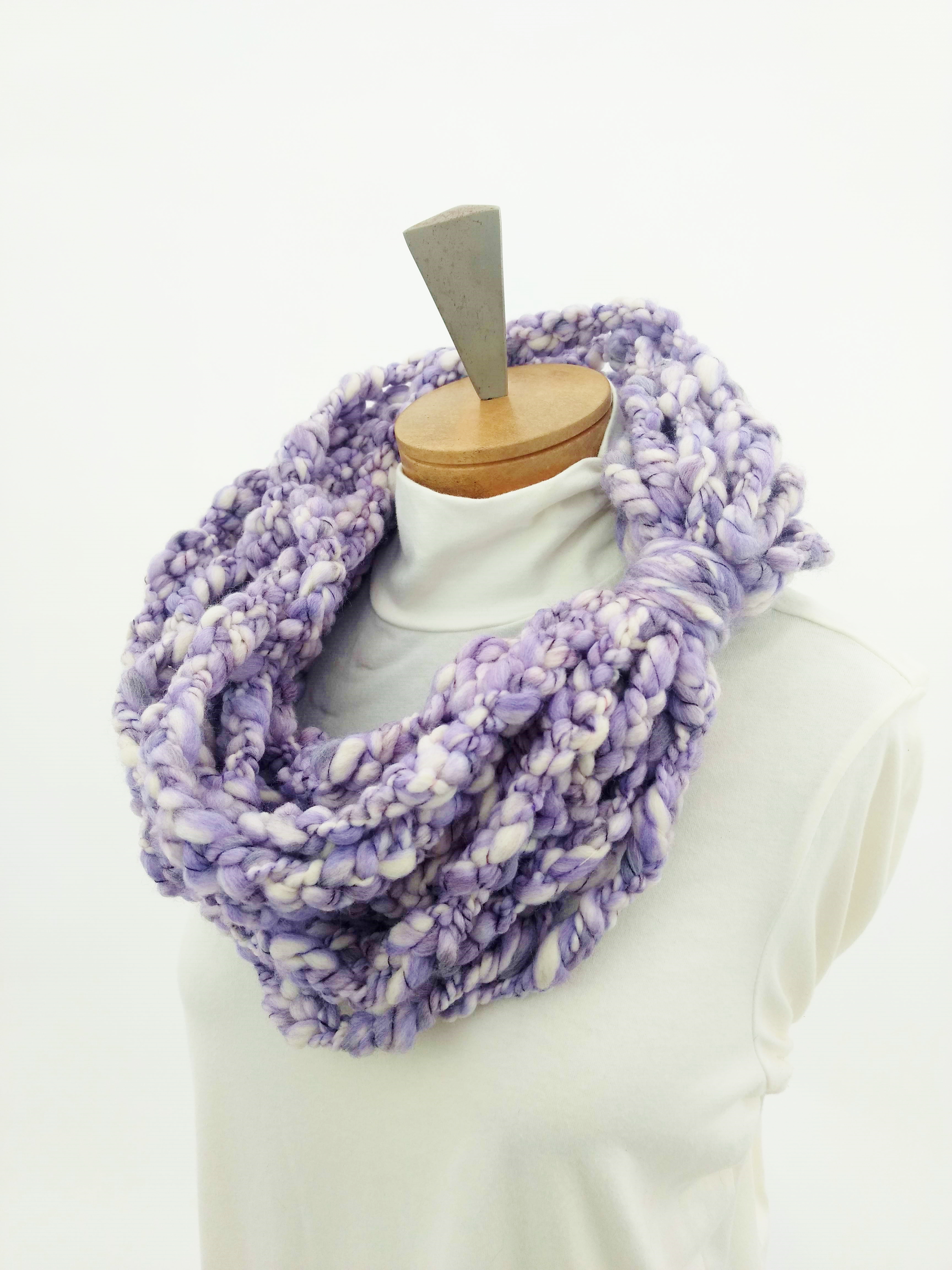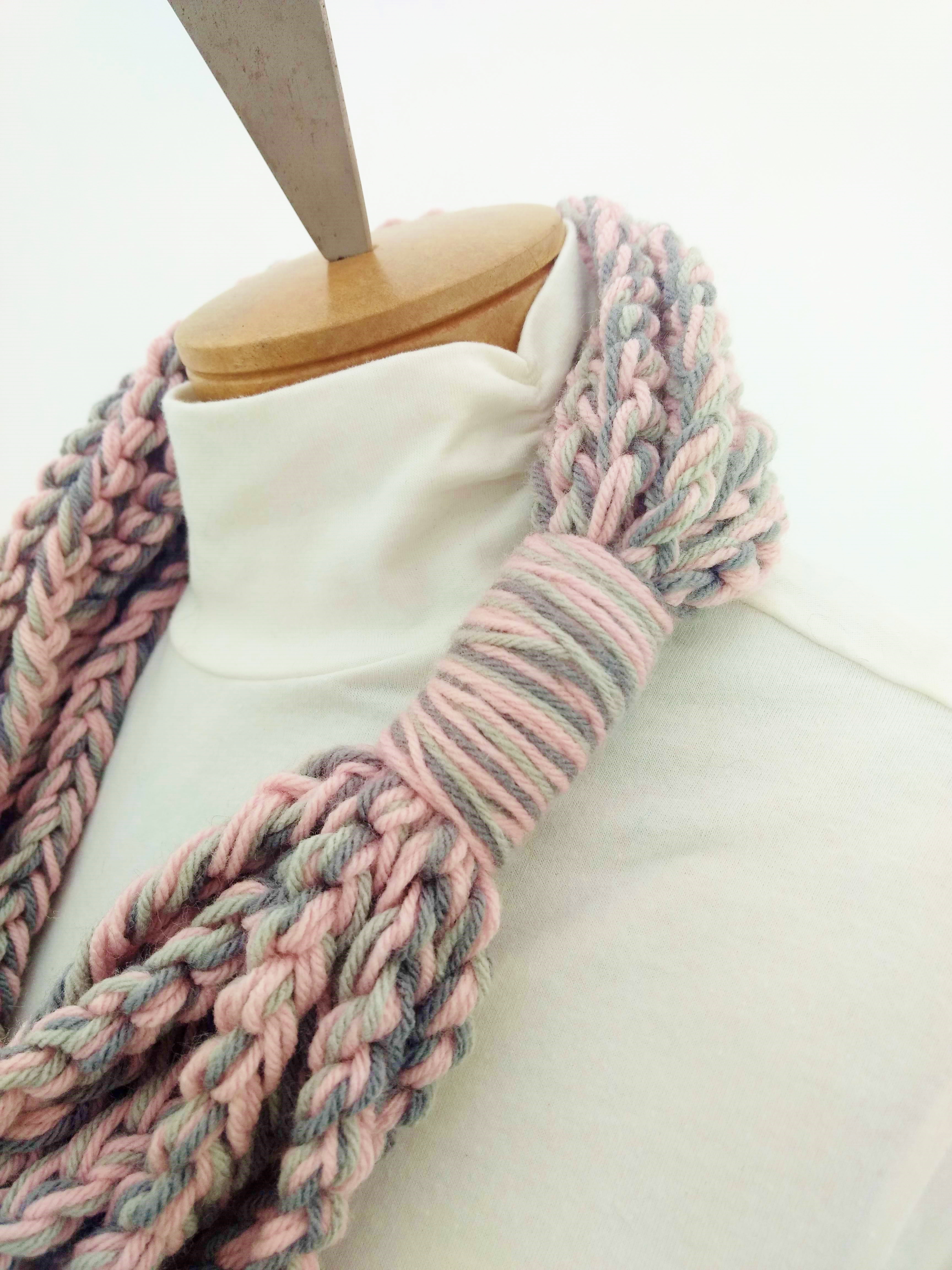 My scarves are handmade by me in my smoke-free, pet-free home studio. I finger crochet each one, rarely using a crochet hook. Each scarf is made of one long crochet chain creating a rope. I then create multiple loops by making a winding cuff of the same yarn around all the strands to hold them together. I keep each scarf a certain size with the help of a board that my husband, Ricky, made me so each one is measured appropriately before finishing. I have different size boards so I can choose how long or short to make each scarf. Each one takes three to four hours to make depending on how many strands of yarn I use, the texture of the yarn, and the size of each strand. What I love most about my scarves is that they can be worn indoors and out. They are the perfect weight to keep you warm with or without a coat. They add a unique look to any outfit. Most of my scarves are OOAK (One of a Kind), meaning you will not see another person wearing a replica.