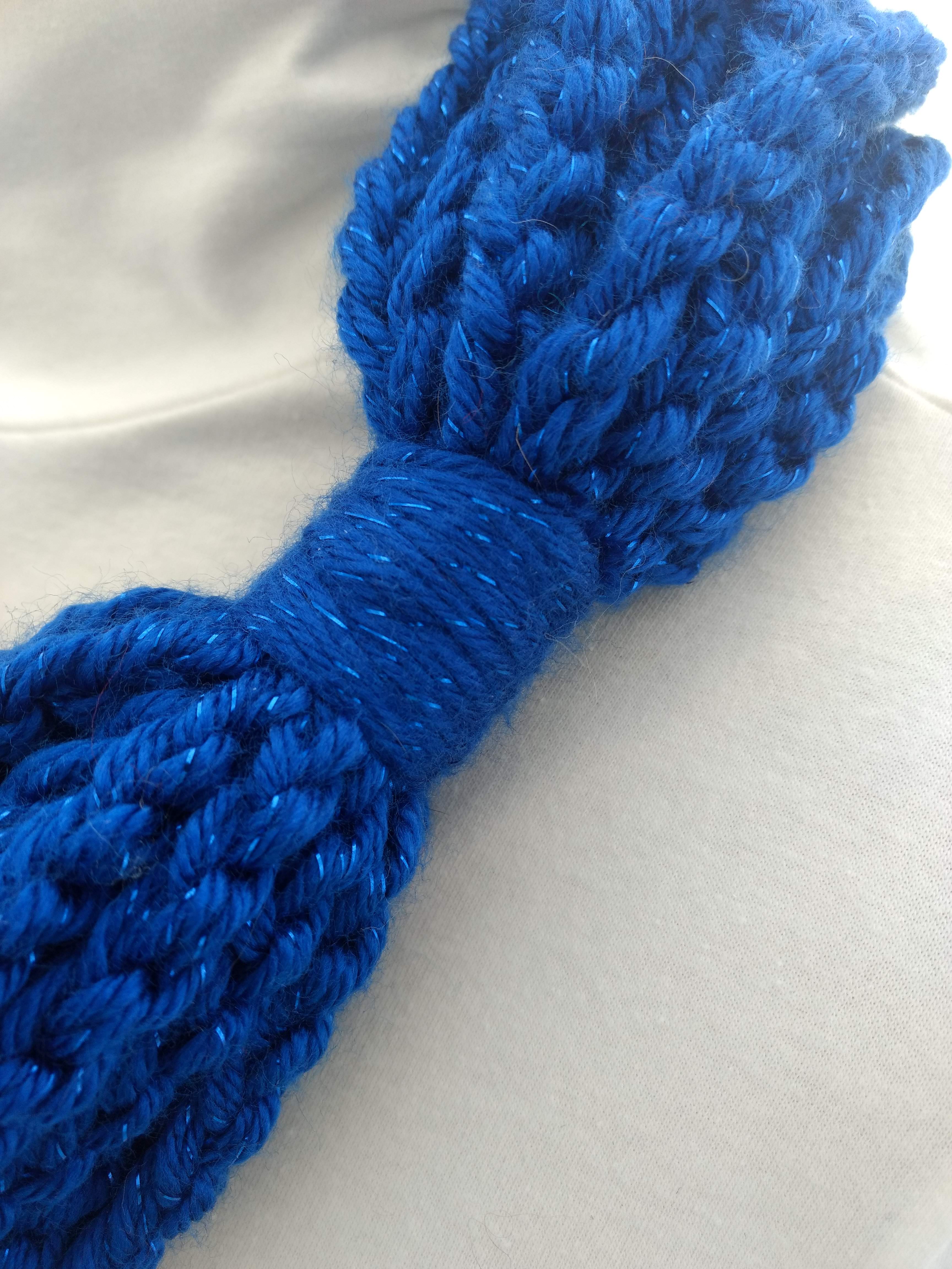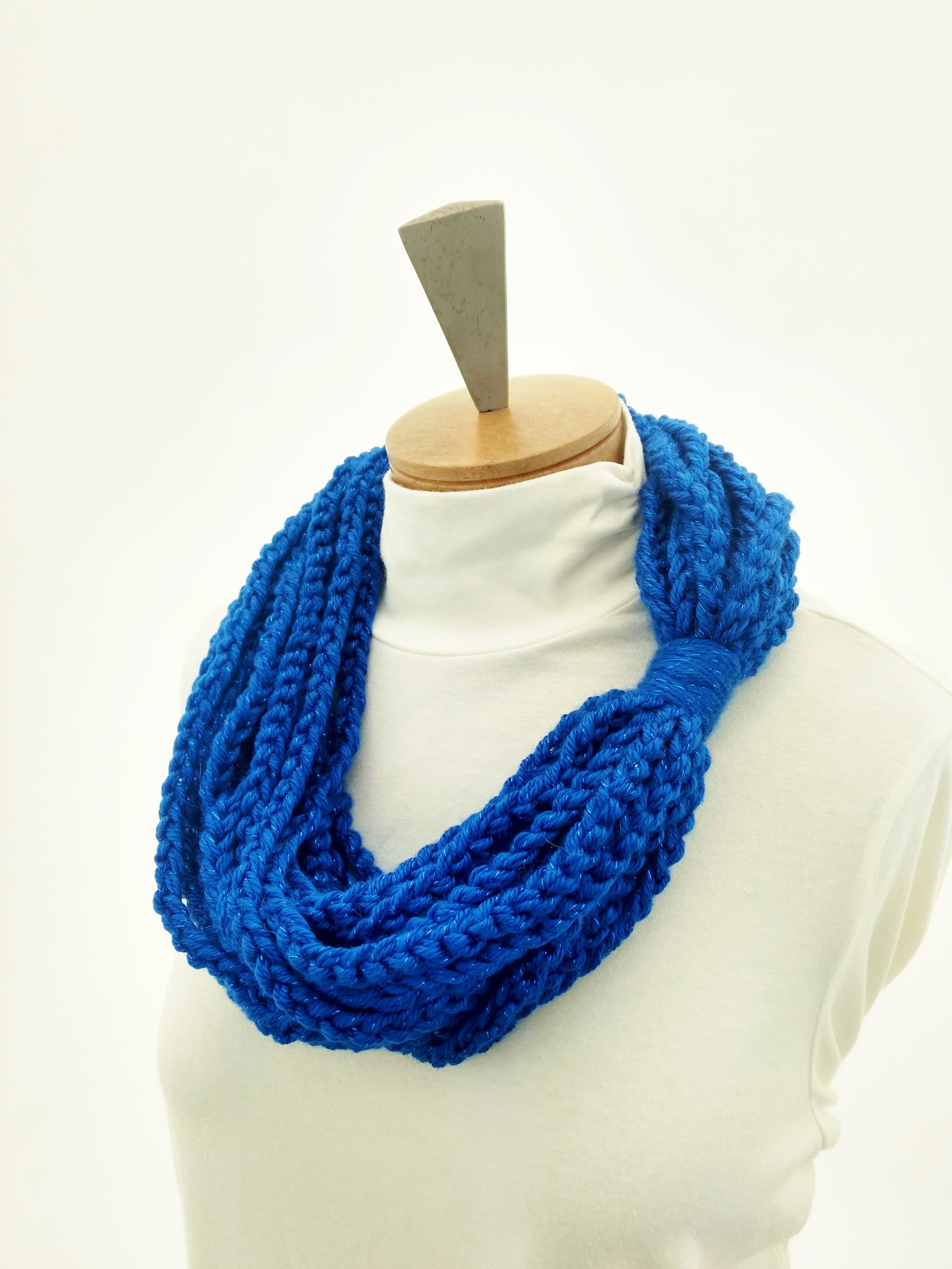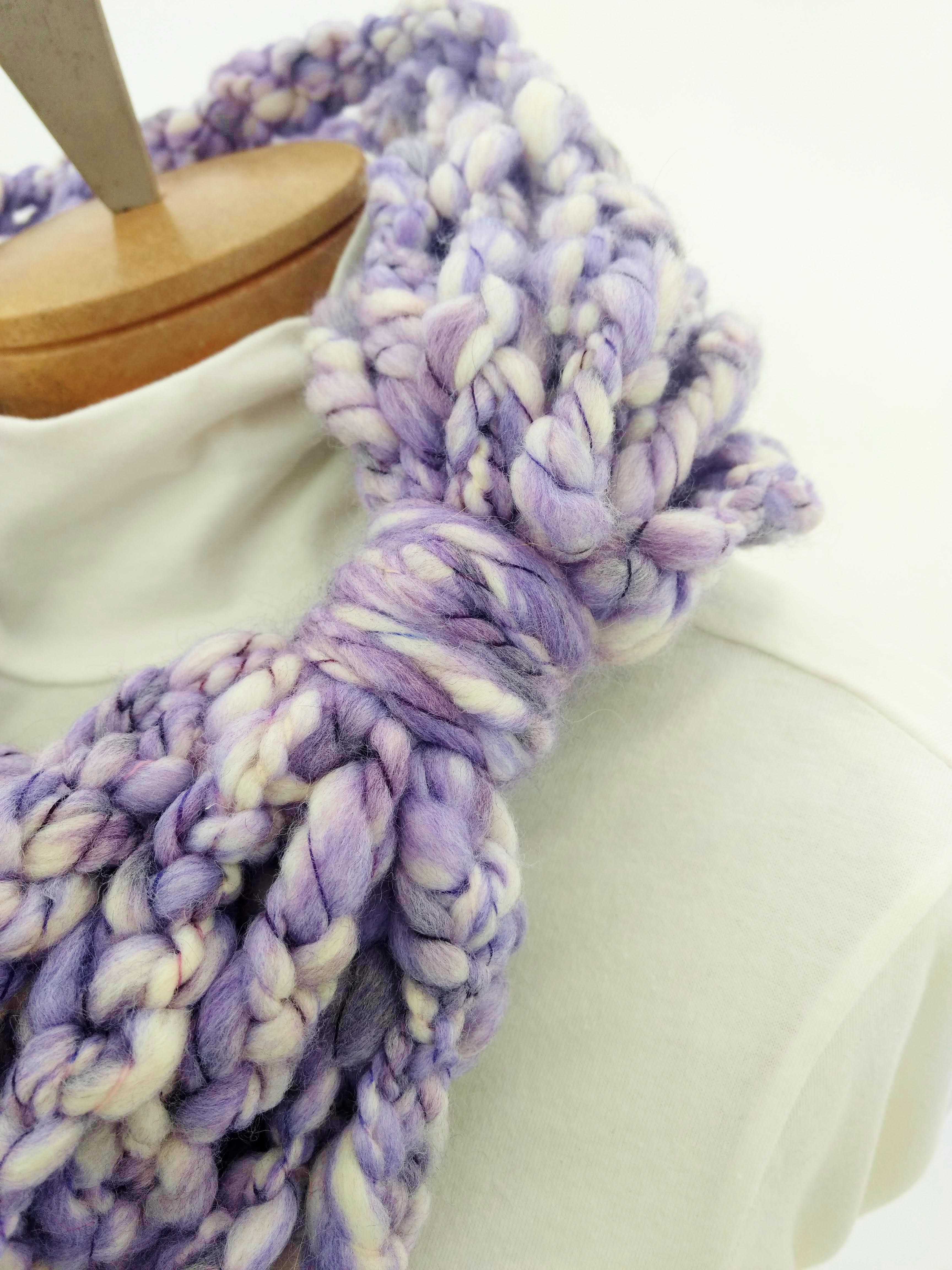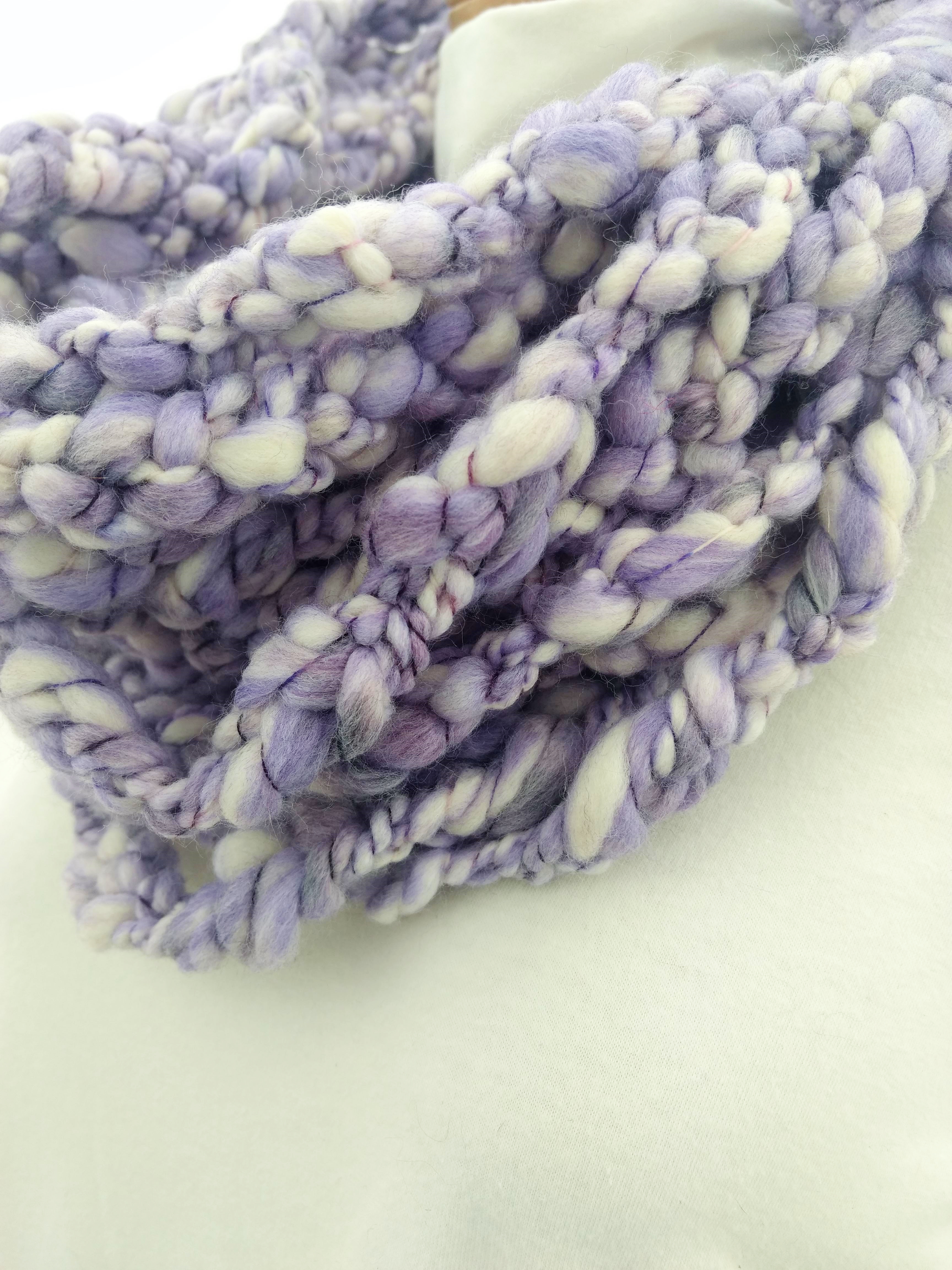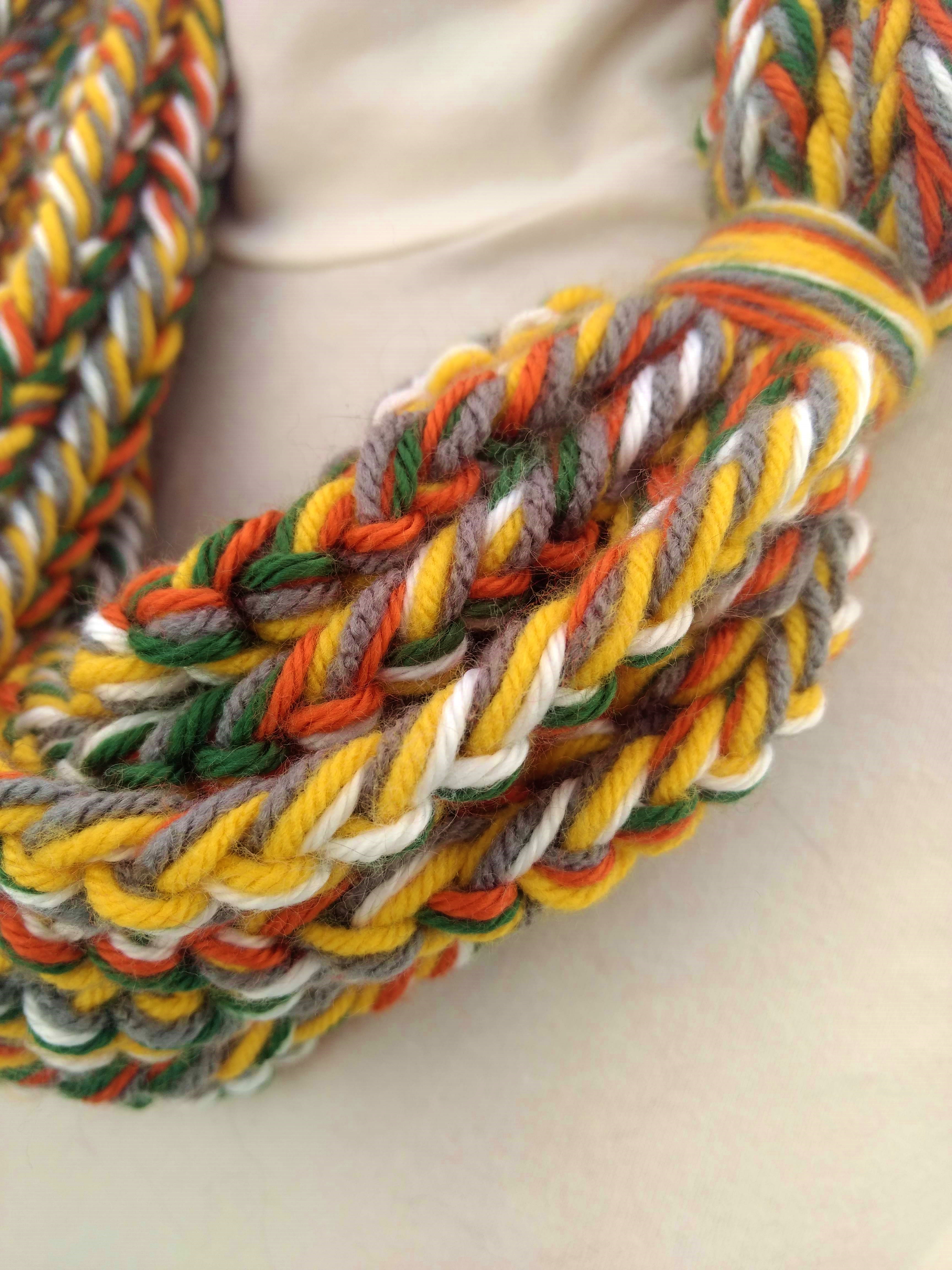 My scarves are handmade by me in my smoke-free, pet-free home studio. I finger crochet each one, rarely using a crochet hook. Each scarf is made of one long crochet chain creating a rope. I then create multiple loops by making a winding cuff of the same yarn around all the strands to hold them together. I keep each scarf a certain size with the help of a board that my husband, Ricky, made me so each one is measured appropriately before finishing. I have different size boards so I can choose how long or short to make each scarf. Each one takes three to four hours to make depending on how many strands of yarn I use, the texture of the yarn, and the size of each strand. What I love most about my scarves is that they can be worn indoors and out. They are the perfect weight to keep you warm with or without a coat. They add a unique look to any outfit. Most of my scarves are OOAK (One of a Kind), meaning you will not see another person wearing a replica.