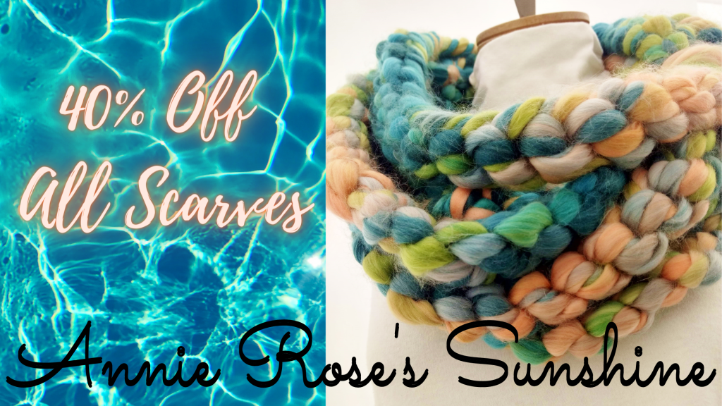 Handmade Infinity Rope ScarvesScarf Sale. June 9, 2021 Adrianne I am having a scarf sale to make room for new inventory. All scarves are 40% till June 14th, 2021. Shop the sale at Annie Rose’s Sunshine here. Share this: Click to share on X (Opens in new window) X Click to share on Facebook (Opens in new window) Facebook Click to email a link to a friend (Opens in new window) Email Click to share on Pinterest (Opens in new window) Pinterest Click to share on Telegram (Opens in new window) Telegram Like Loading... Published by Adrianne I am a wife, pet parent, business owner, singer, musician, jewelry designer, blogger, bookworm, photographer, and nature lover. View all posts by Adrianne