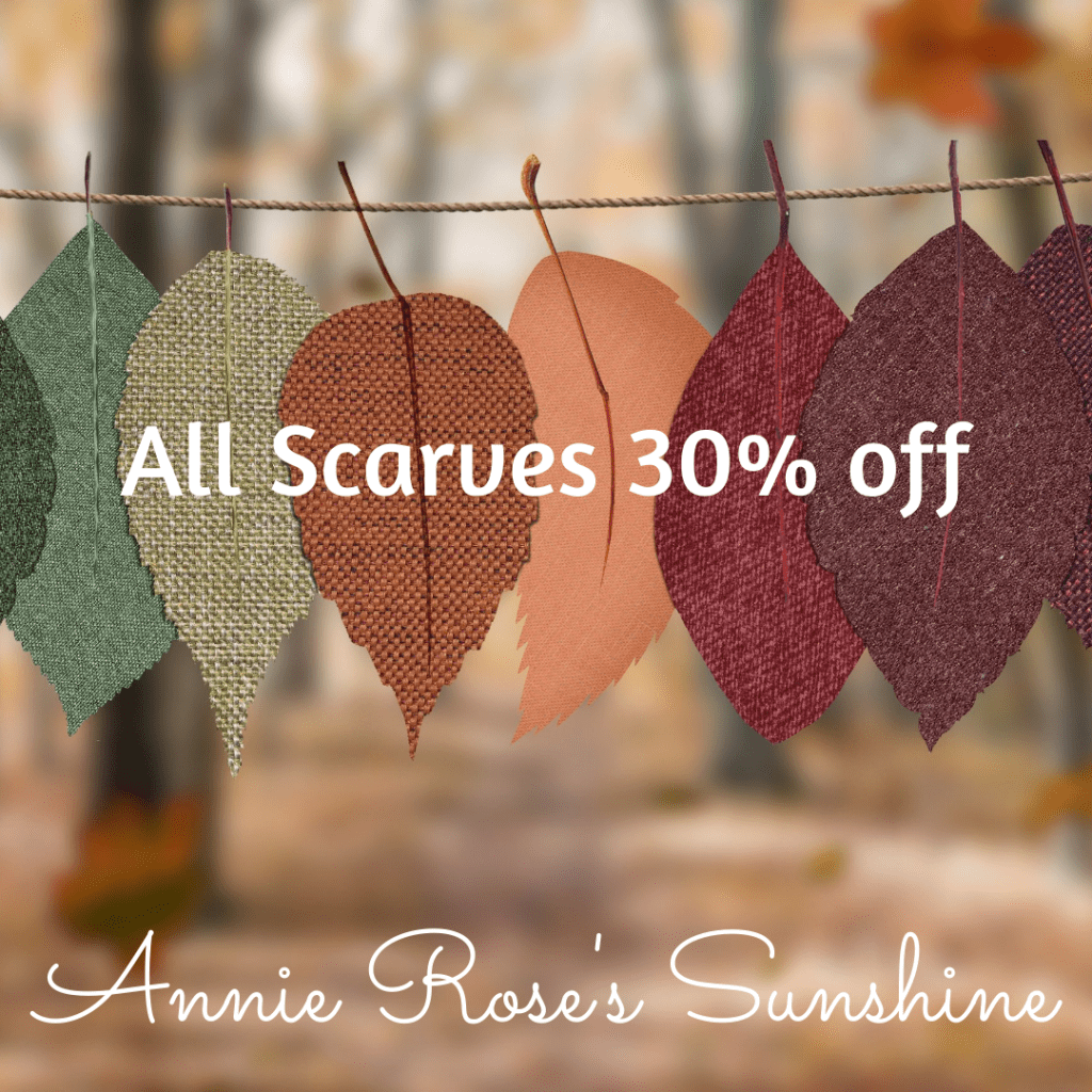 All scarves are 30% now through Nov. 1st, 2021 at Annie Rose’s Sunshine